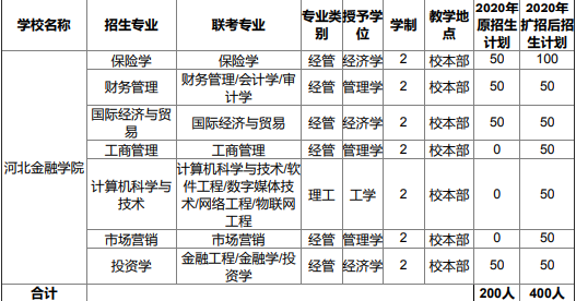 和2020年擴(kuò)招前相比,2020年河北金融學(xué)院招生新增了工商管理、計(jì)算機(jī)科學(xué)與技術(shù)、市場(chǎng)營(yíng)銷專業(yè), 但保險(xiǎn)學(xué)專業(yè)招生新增50人,其他財(cái)務(wù)管理、國(guó)際經(jīng)濟(jì)與貿(mào)易、投資學(xué)專業(yè)招生前后并無(wú)變化。